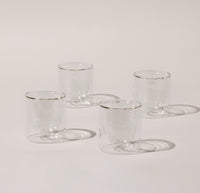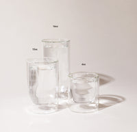 Double-wall glass insulates for a cool to touch experience without the need for a handle. The form visually suspends liquid in the center, putting your coffee, tea, cocktails or water on elegant display.