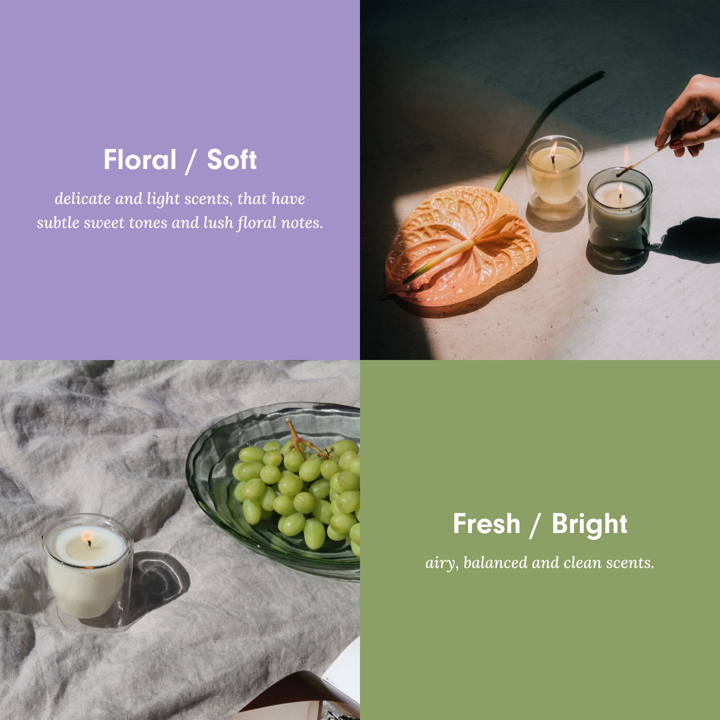 Inspired by Chamaemelum nobile, also known as Roman Chamomile. The Chamomile series reveals an herbal bouquet of apple blossom, lavender, and calming white tea. Feels like: picnicking on a cool, summer day.